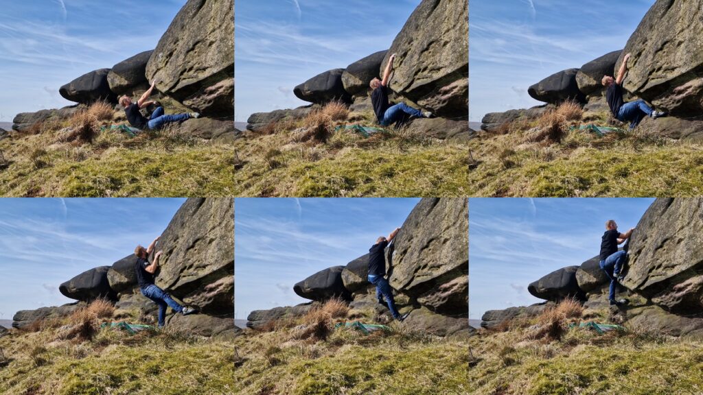 I’d tried this earlier in the year, and ended up doing a variant where I started left hand on the bulbous footledge, and right hand on a good sloper. It was only one or two moves, and a fair bit easier than the guide grade, so it ended up weighing on my mind throughout the year.